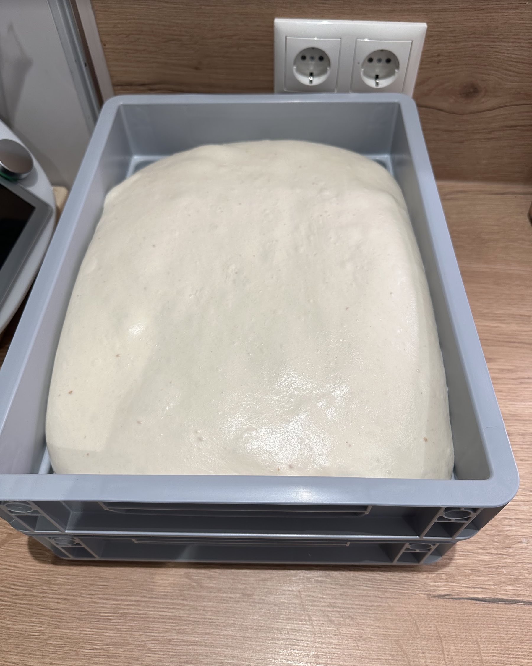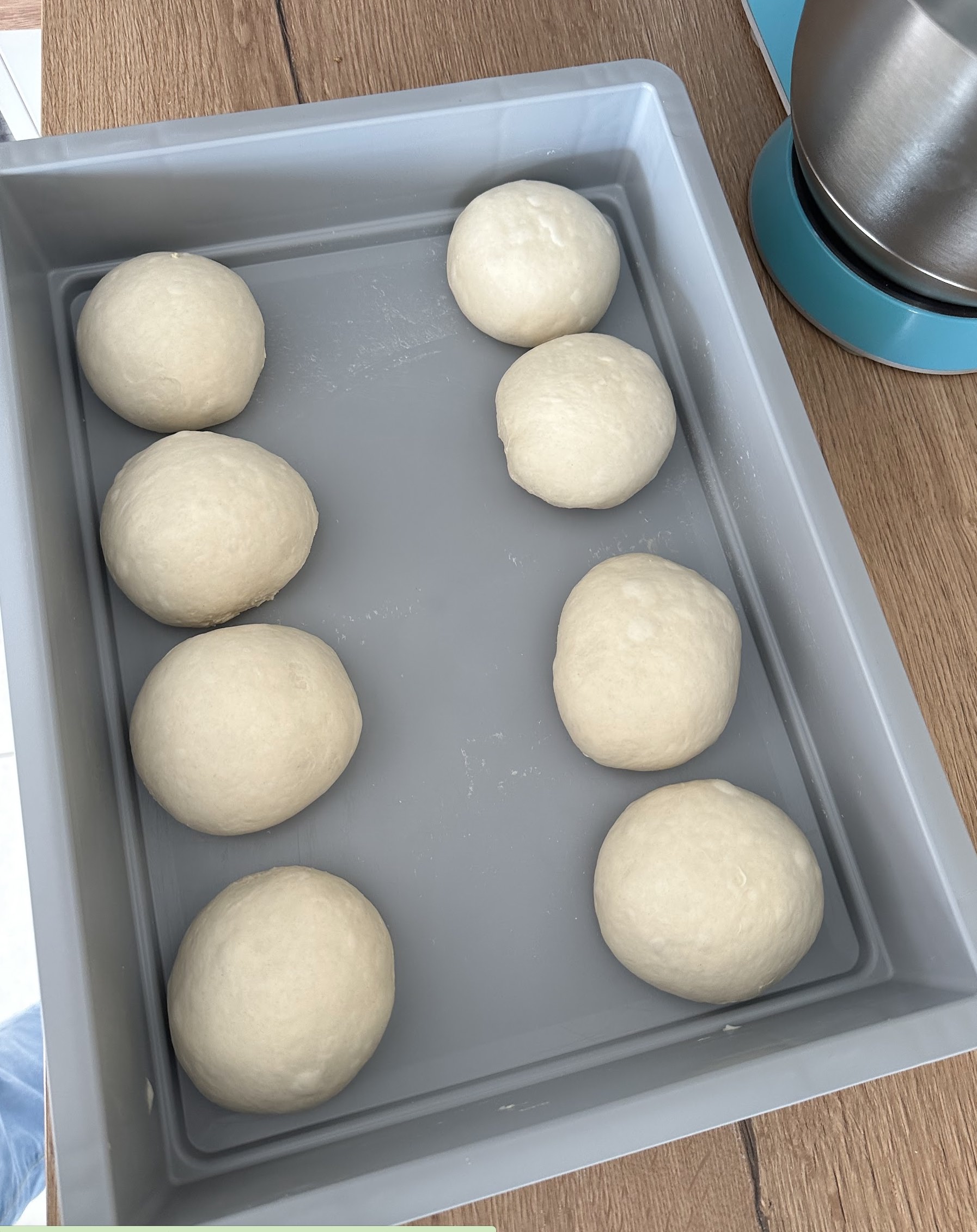 3-5 Stunden bevor es Pizza geben soll, den Teig aufteilen und Ballen formen (6 x 280g oder 8 x 200g).